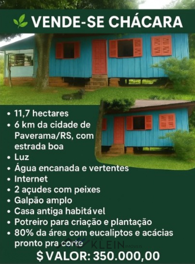 Possui uma casa antiga, galpão pra animais, 2 açudes, mato de eucalipto e acácia prontos para corte, vertente, internet, potreiro, distante apenas 6 km do centro da cidade de Paverama.